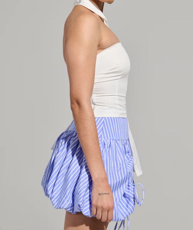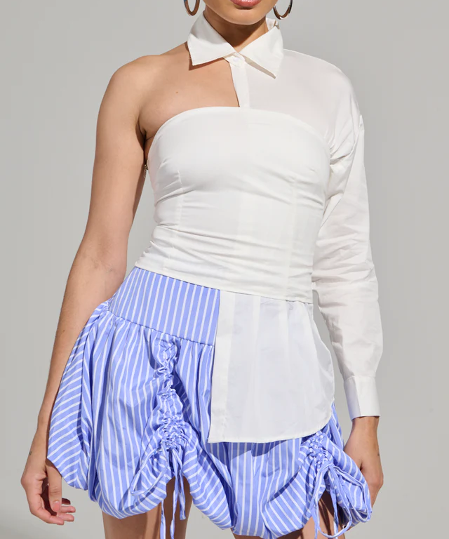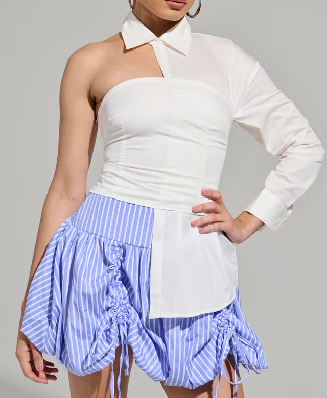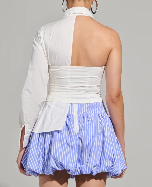 Asymmetrical Poplin Blouse is a structured cotton blend top that features a button front pointed collar, an asymmetrical neckline, one open shoulder and one long sleeve with a button-adorned cuff, and an elasticated corset-inspired overlay with a paneled construction, and a cropped design. Complete with a slightly pleated, extended hem on one side, and a faux silver metallic side zipper closure. Style with a denim midi skirt and mules for a sophisticated finish.