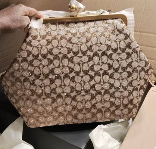 Omg I love so much - pretty AND practical! Big enough to hold all my stuff. Reviewer who said the kiss lock doesn’t work should return hers! Mine works great. Added my own gold chain for when I want to wear it longer.
