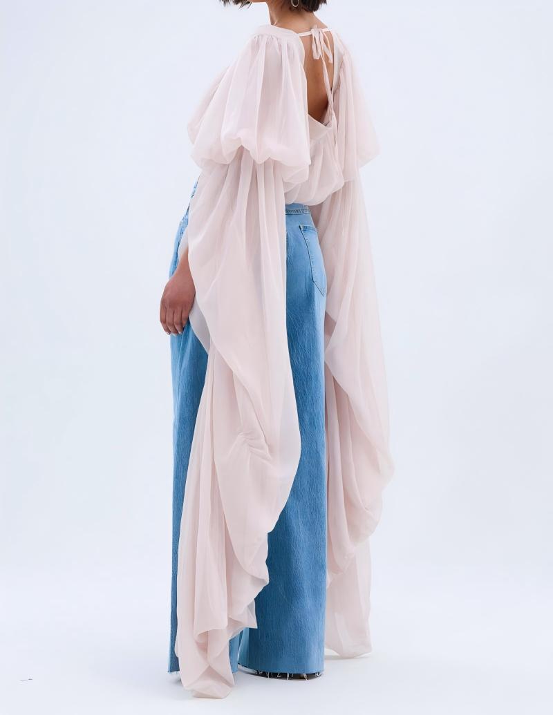 This romantic and breezy piece is crafted from a whisper-light, sheer fabric and features a soft square neckline, gathered bodice, and a dramatically draped high-low hem, lending relaxed grandeur to any outfit. Billowy sleeves and a delicate neck tie enhance its ethereal charm, making it ideal for day or evening wear.