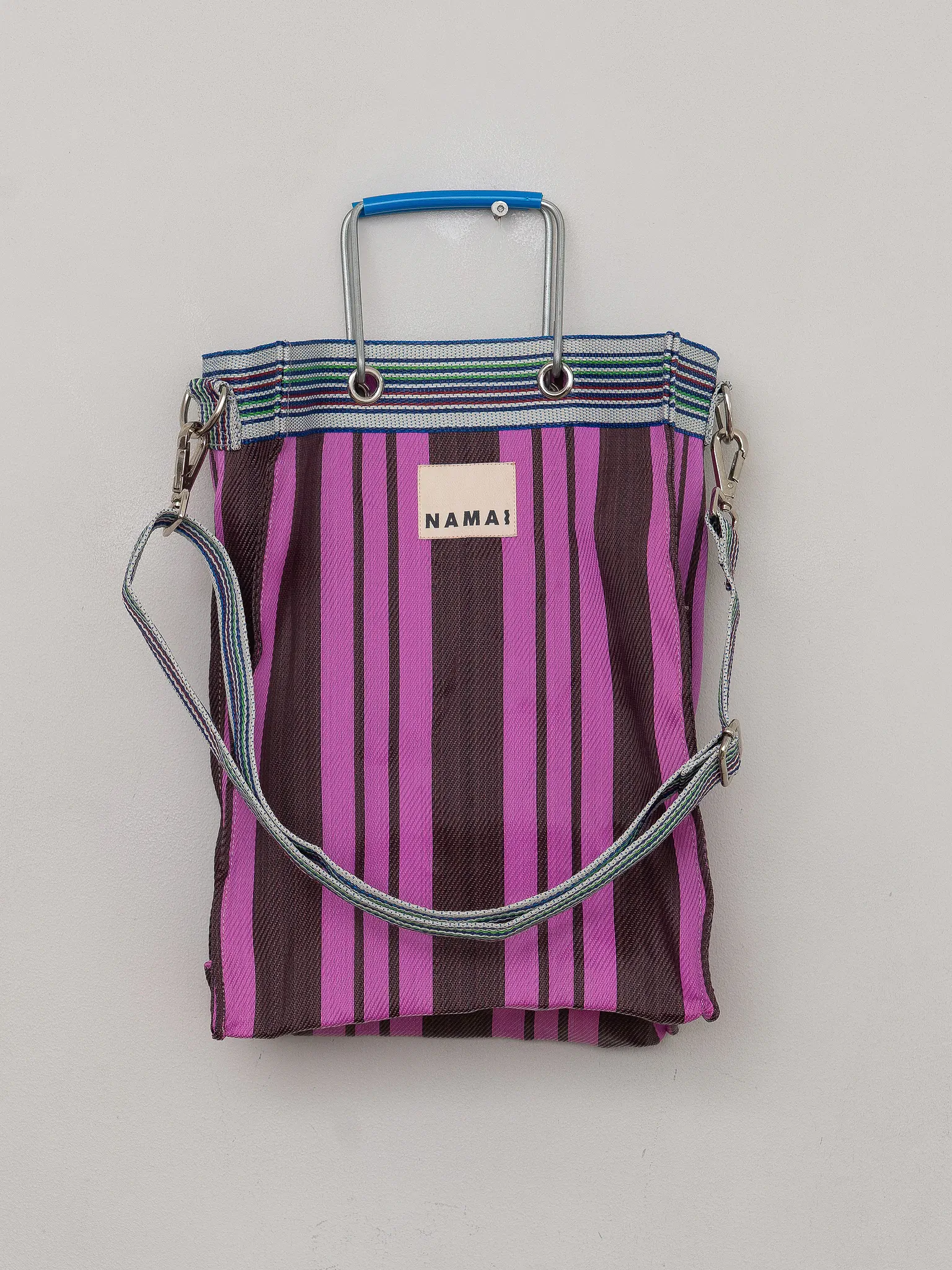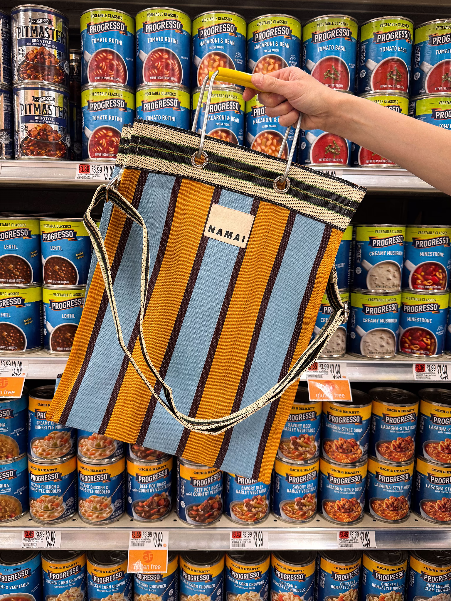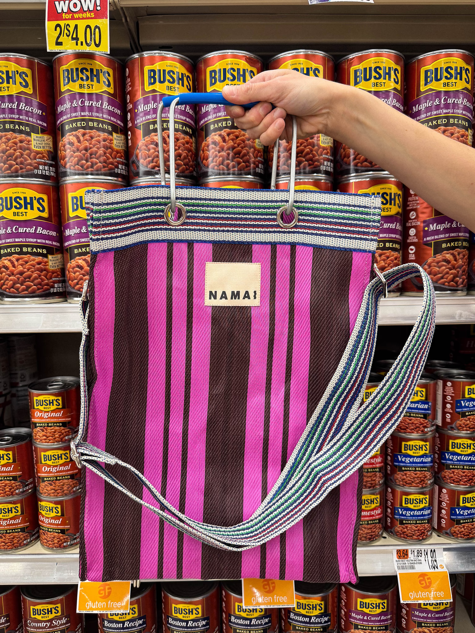 A versatile market bag with a removable shoulder/ crossbody strap and classic metal shopping handle. Sturdy hardware and fun color combinations combine utility and style. Works for carrying a laptop, light groceries, picnics, and on the beach.